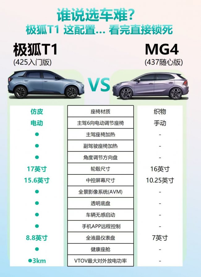 售后方面极狐T1也更让人省心,它在全国214个城市有528家门店,还有149家在建设中,就拿北京来说,极狐有15家门店,MG4只有3家,后续MG4计划扩展到120家左右,但目前来看,极狐的网点覆盖更全,不管是看车、试驾还是后期保养,都比MG4方便不少。而且极狐T1“入门即享”的配置特别良心,就拿入门的320PRO版来说,17英寸轮毂、15.6英寸中控屏、8.8英寸全液晶仪表都是标配,还有无感启动和健康座舱,MG4入门款用的是16英寸轮毂、10.25英寸中控屏和7英寸组合液晶仪表,差距很明显。主动安全上,极狐T1有360°全景影像和透明底盘,窄路会车、过坎时能看清周围情况,新手也能轻松开,这些实用配置在MG4入门款上是没有的。